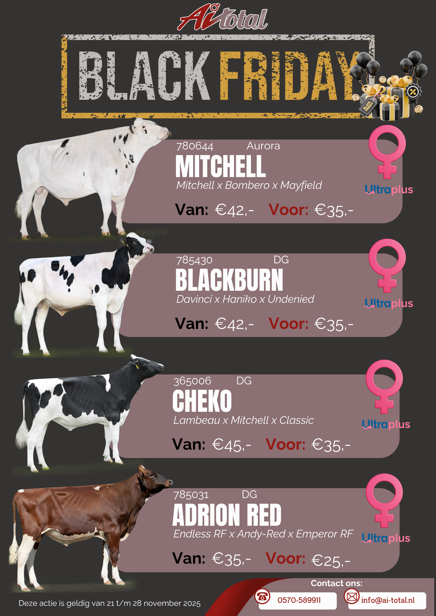 BLACK FRIDAY DEALS! Deze week pakt AI-Total Nederland groots uit met een scherpe Black Friday deal op gesekst (Ultraplus) sperma van AURORA MITCHELL, DG BLACKBURN, DG CHEKO & ADRION-RED! AURORA MITCHELL (Mitchell x Bombero) is een dochtergeteste stier, ingeschreven met EX-91 en heeft inmiddels 757 dochters in zijn Nederlandse index. Zijn eerste dochters zijn inmiddels […]