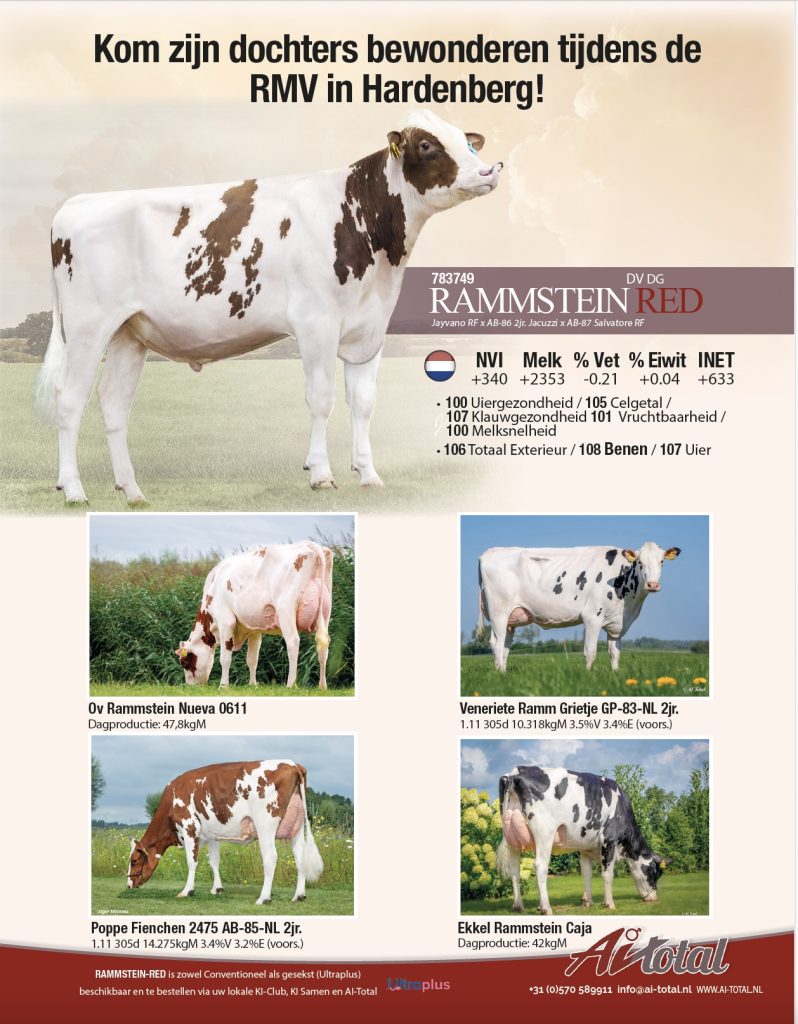 21, 22 en 23 oktober 2025 tijdens de RMV in Hardenberg kunt u zijn melkgevende dochters komen bewonderen in hal 7! U bent van harte welkom in onze AI-Total stand in Hardenberg om onder het genot van een kop koffie met onze collega’s te praten en de dochtergroep van RAMMSTEIN-RED te bewonderen!